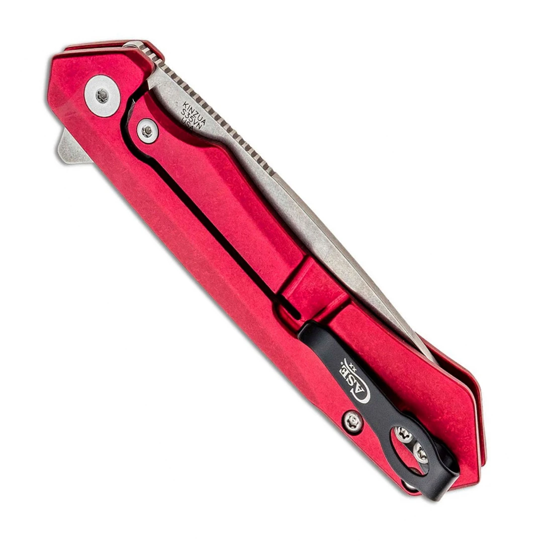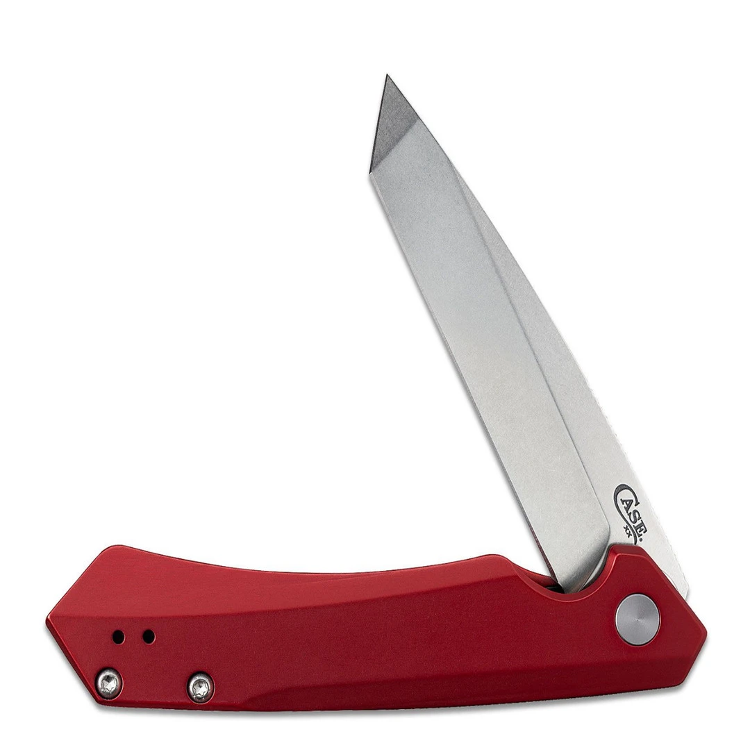 The Case Red Anodized Aluminum Kinzua Knife features a single tough blade. The Tanto blade shape is inspired by Japanese swords and offers a stronger tip for better piercing strength. Paired with a handle made of aluminum, this knife is strong and lightweight, making this knife a beautiful addition to any collection.
