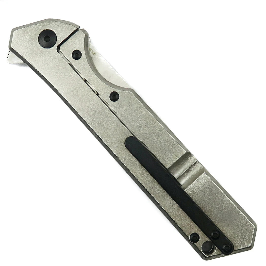 The Olamic Cutlery Rainmaker features a satin finished Bohler M390 drop point blade paired up with orange peel finished 6AL-4V titanium handle scales for a classic look.